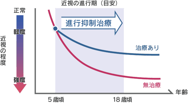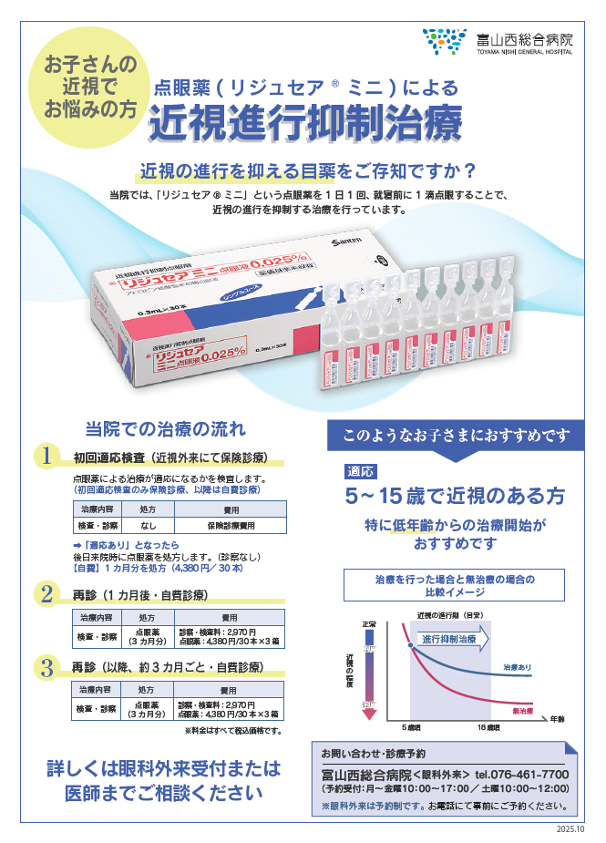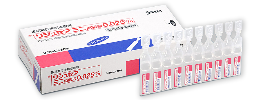 当院では、近視でお悩みのお子さんに対し、「リジュセア® ミニ」という点眼薬を1 日1 回、就寝前に1 滴点眼することで、近視の進行を抑制する治療を行っています。