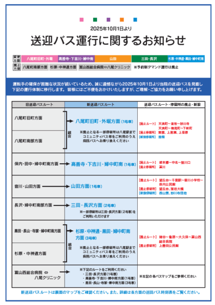 運転手の確保が困難な状況が続いているため、誠に遺憾ながら、2025年10月より当院の送迎バスの土曜日の運行を休止いたします。